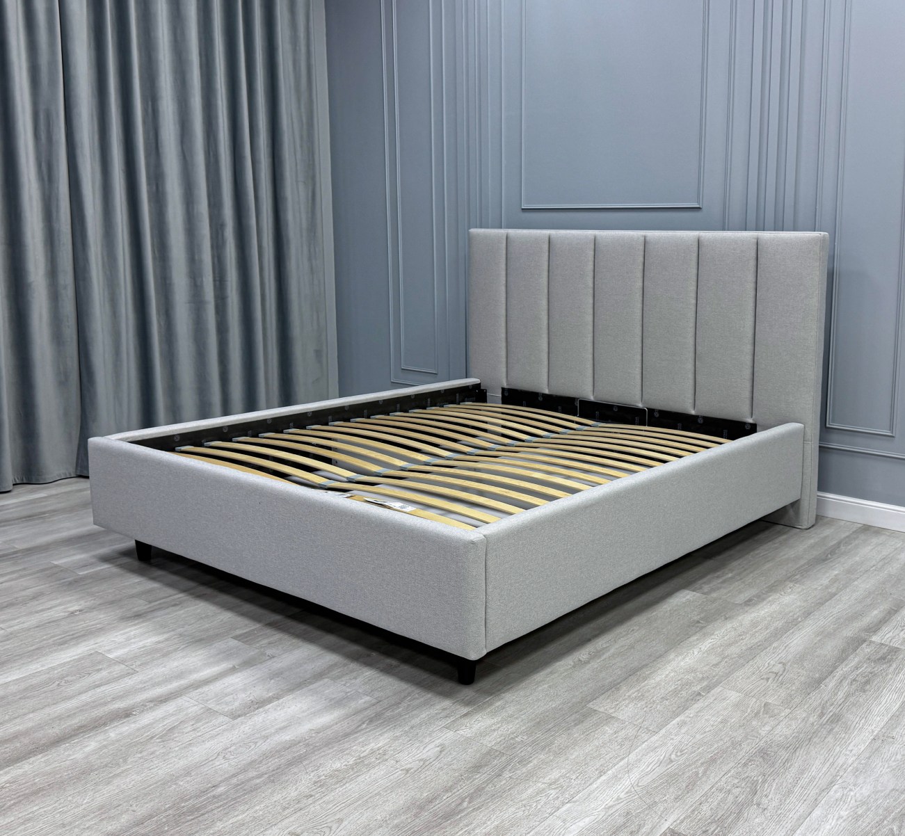 • Изголовье кровати выполнено вертикальными линиями. Данный дизайн актуален и отлично впишется в любой современный интерьер.
