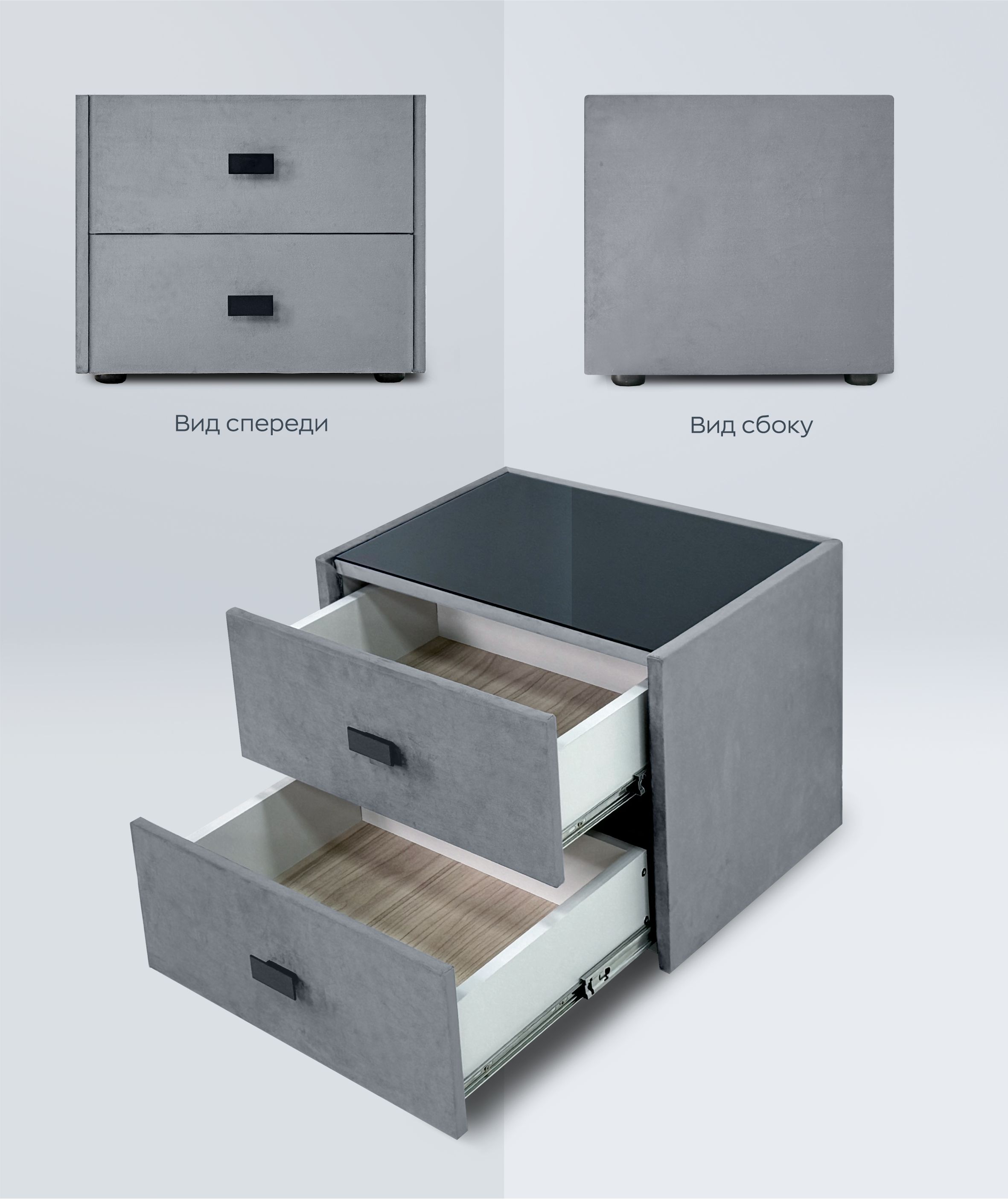Прикроватная тумба органично сочетается с современным интерьером спальни. Оснащена двумя вместительными ящиками с шариковыми направляющими. Крышка тумбы комплектуется стеклом, которое защищает мягкое покрытие от загрязнений и механических повреждений.